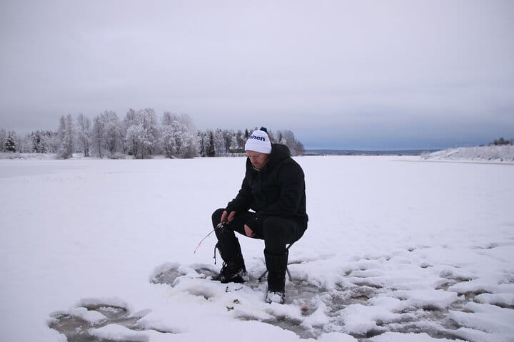 Enjoy ice fishing at a frozen lake! Our guide helps with basics, snacks, and drinks. Feel the thrill of catching fish in the peaceful Arctic. Choose to keep or release your catch, and we'll take you back to your hotel. Book now for a unique winter adventure!"